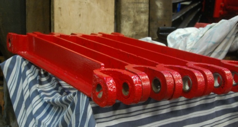 Frame cross-stays are painted and new hardened bushes have been inserted. The stays will be fitted across the frames soon, although it is convenient for the paint crew to leave them to one side for the time being.